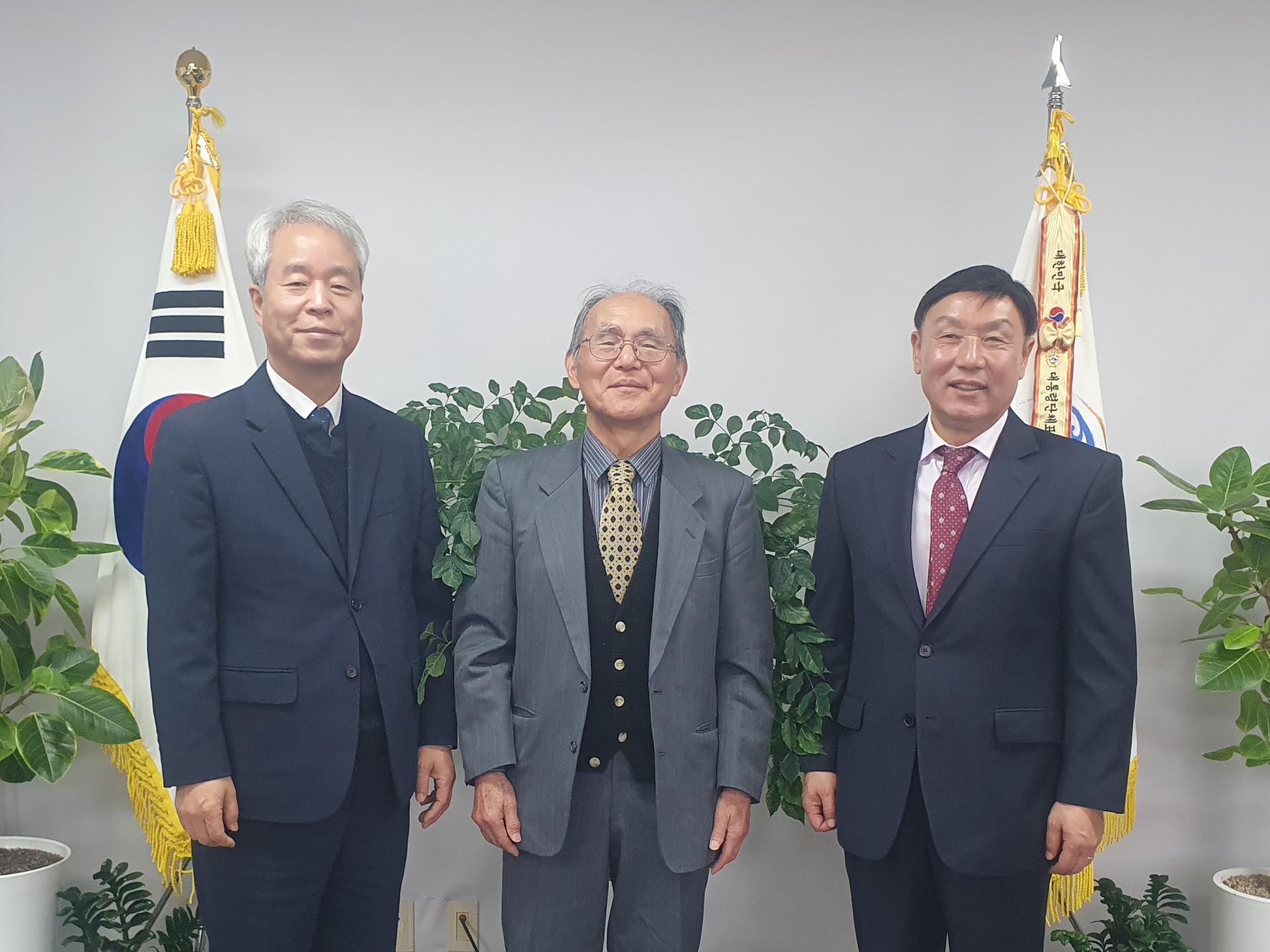 국외소재문화유산재단 곽창용 사무총장(왼쪽), 기증자 미야타 이즈미(가운데), 충남역사문화연구원 장기승 원장(오른쪽)