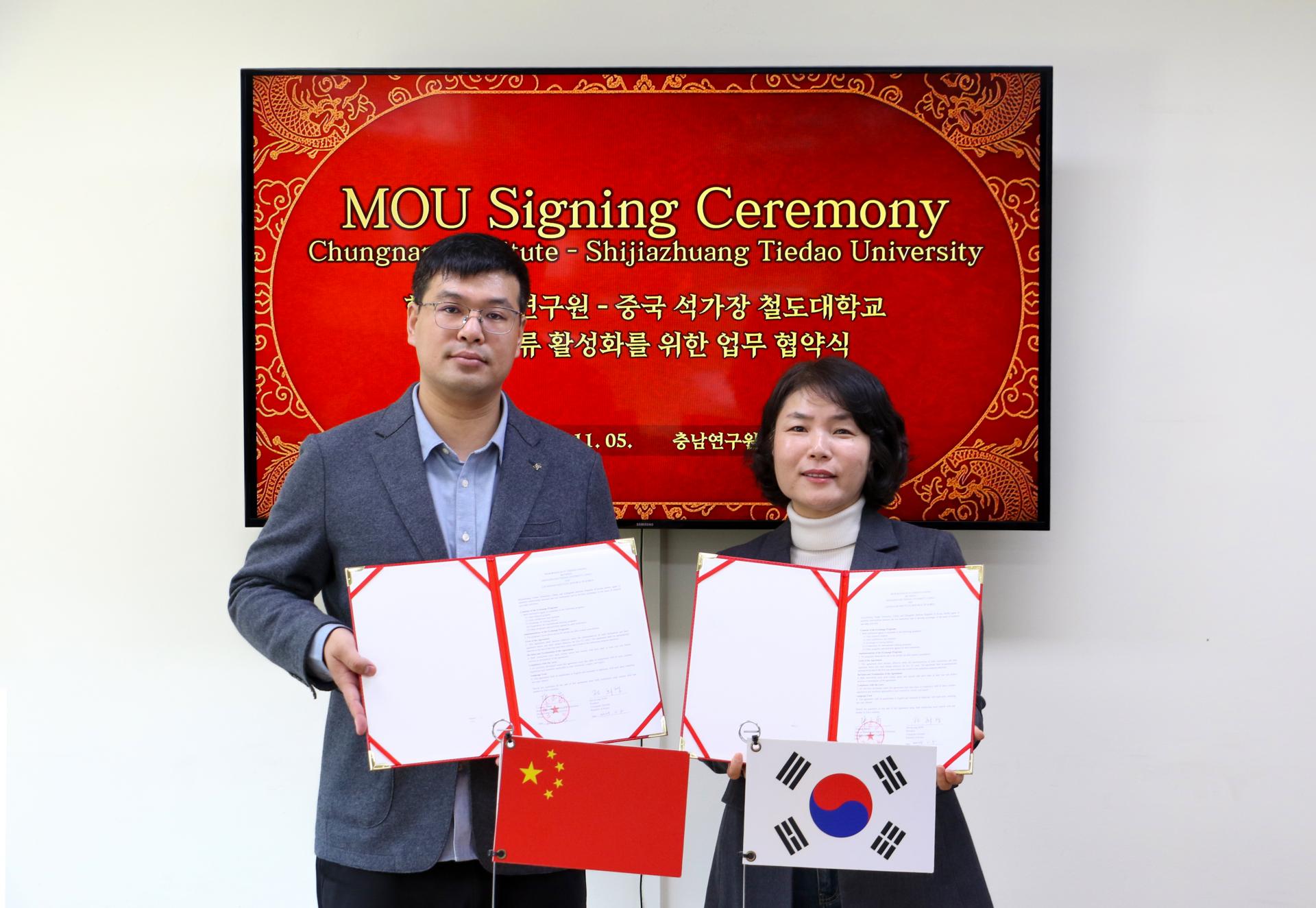 충남연구원(원장 전희경)은 11월 5일 연구원에서 중국 석가장 철도대학교(총장 치시웨이)와 대중교통 및 모빌리티 활성화를 위한 연구교류 협약을 체결했다.
